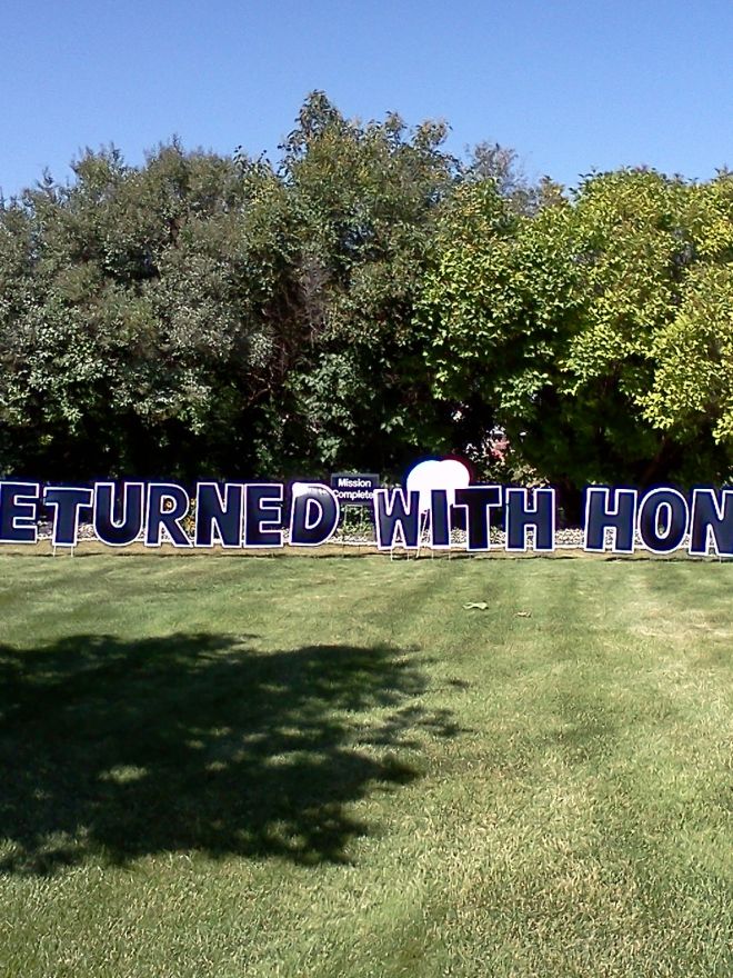 Welcome home a missionary with this "Returned with Honor" sign complete with a missionary cut out and fun yard signs with sayings about missionary service, complete with balloons